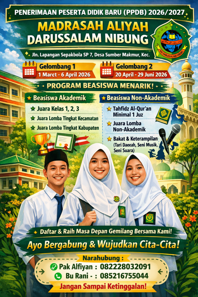 Jangan sampai ketinggalan ya! Daftarkan diri Anda segera dan raih kesempatan menjadi bagian dari keluarga besar MA Darussalam Nibung.